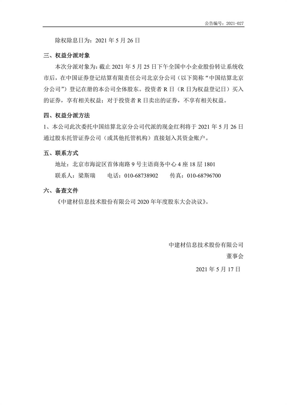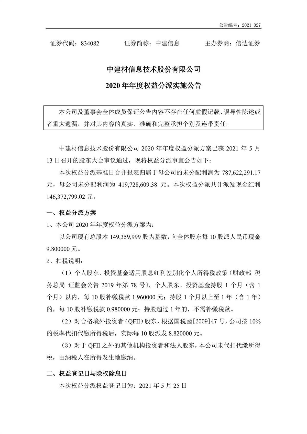 中建信息2020年年度權(quán)益分派實(shí)施公告